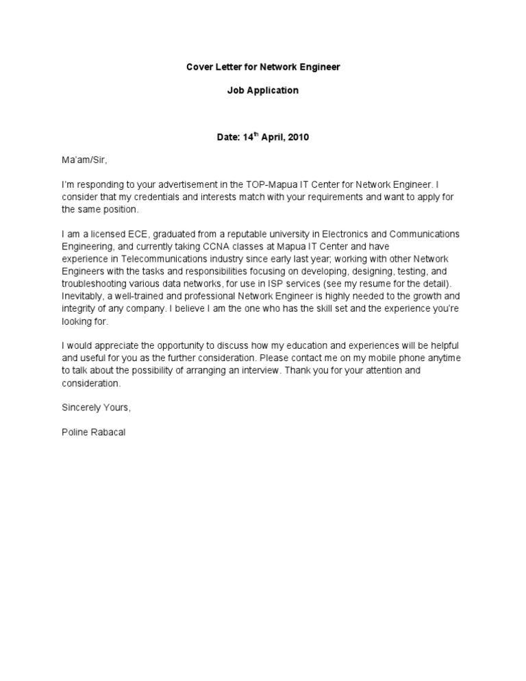 Cover Letter Network Engineer, Information Technology Cover Letter Job Application Letter